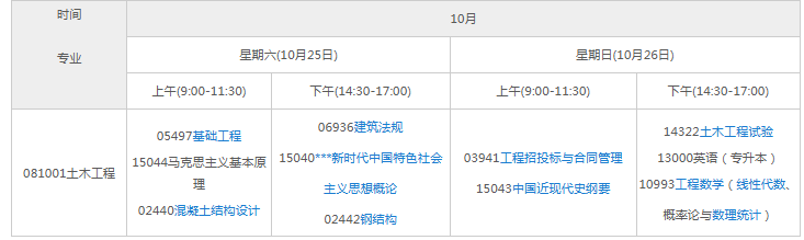 2025年10月甘肃自考土木工程考试科目安排表(081001专升本)