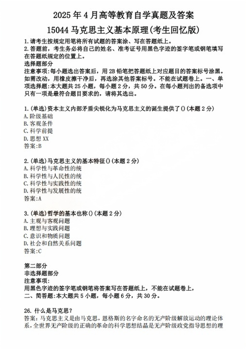 对答案|2025年4月甘肃自考《15044马原》真题及答案解析(考生回忆版)