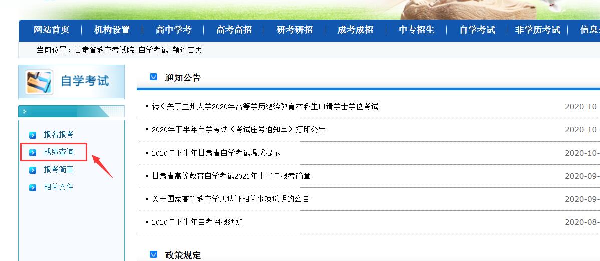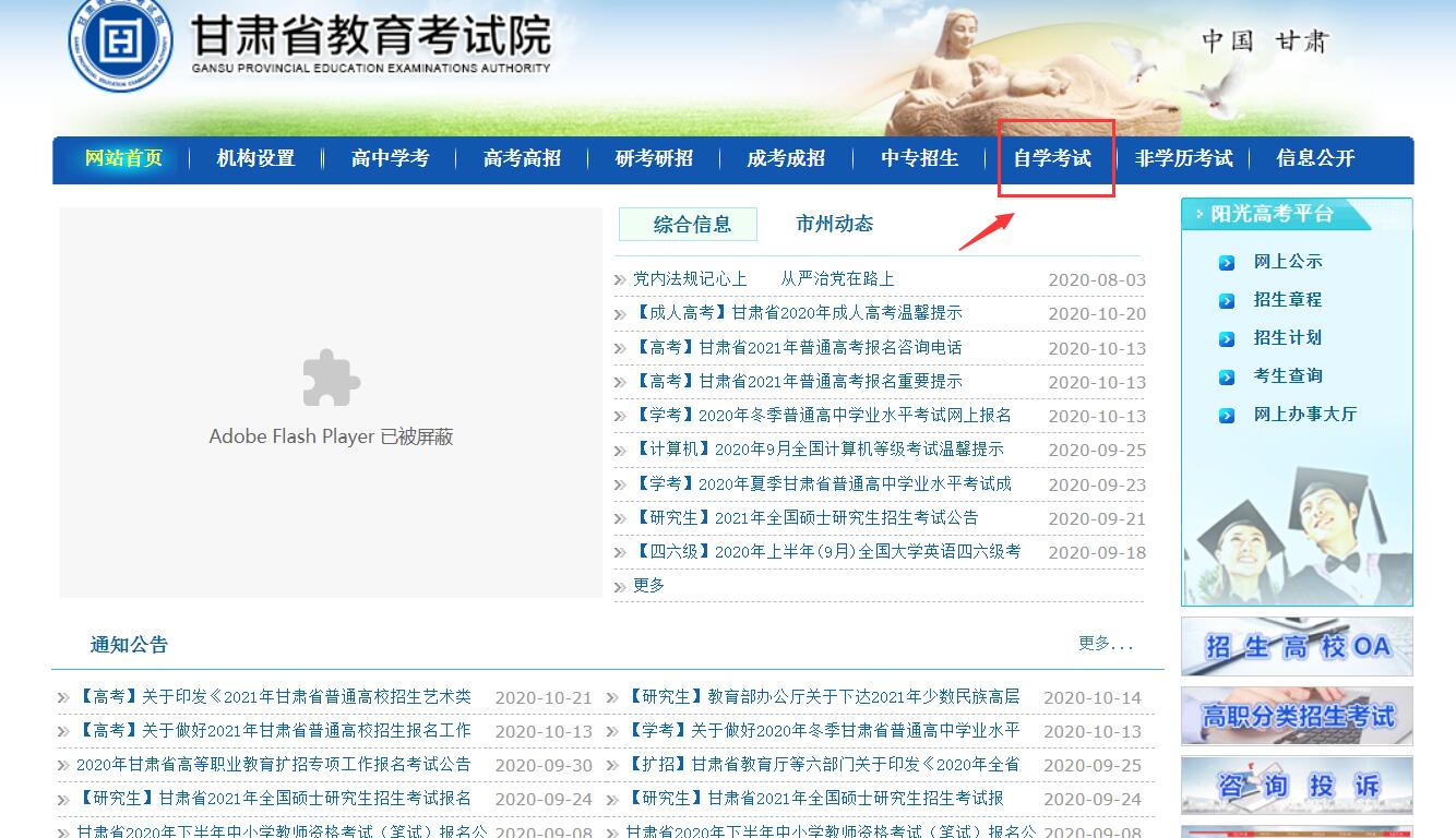 1、考生登录甘肃省教育考试院(https://www.ganseea.cn/),在顶部导航栏点击“自学考试“