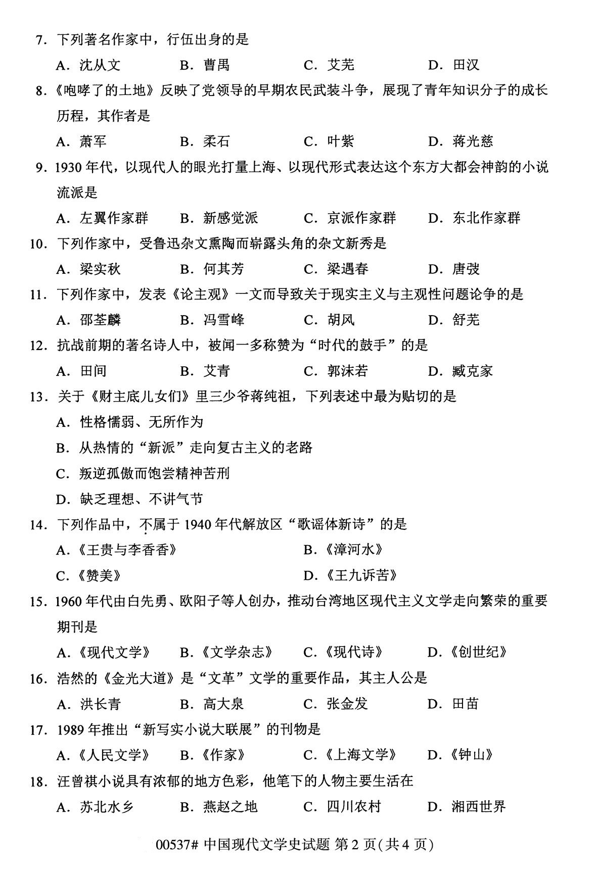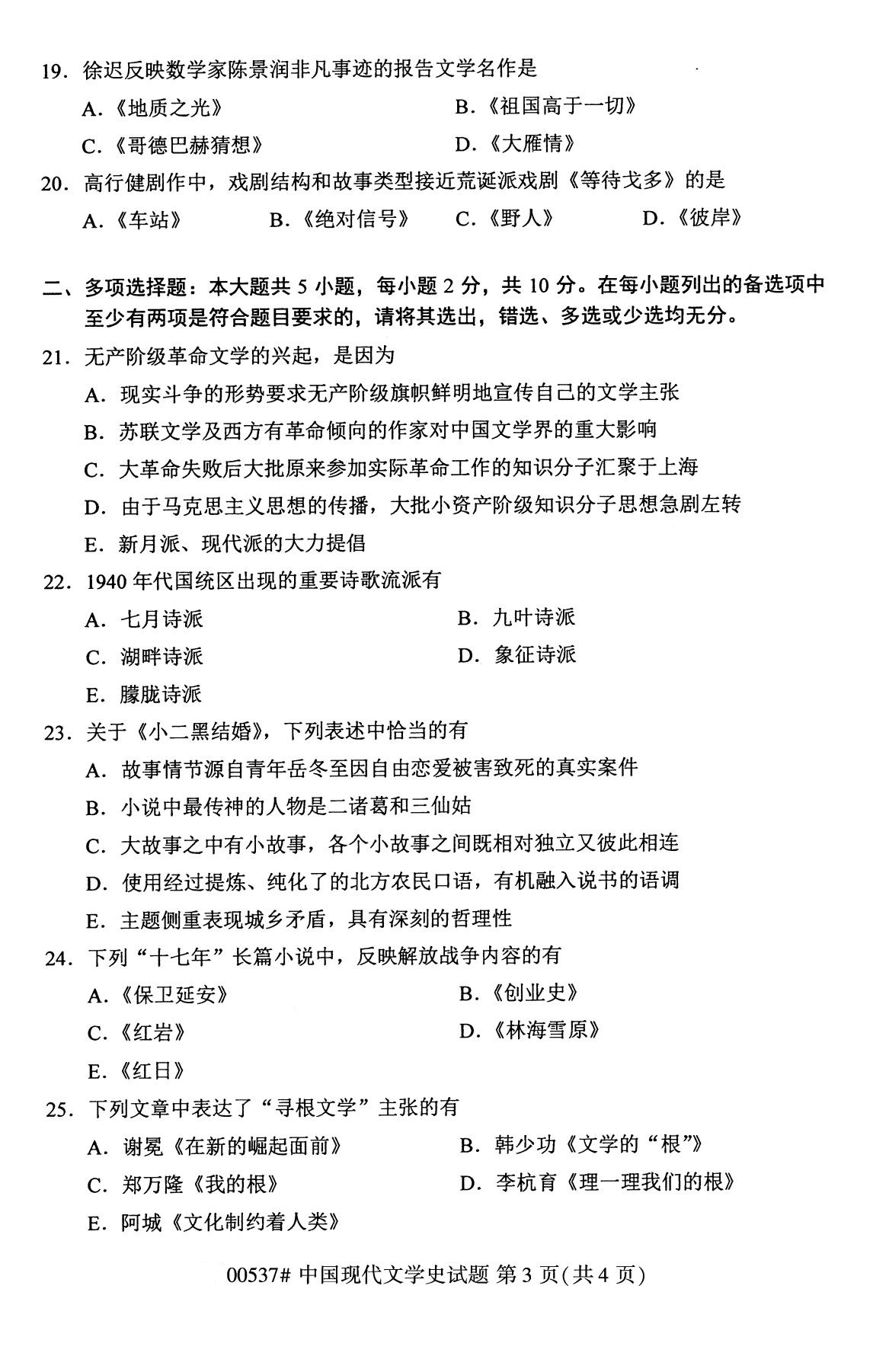 甘肃省2020年8月自学考试本科00537中国现代文学史真题